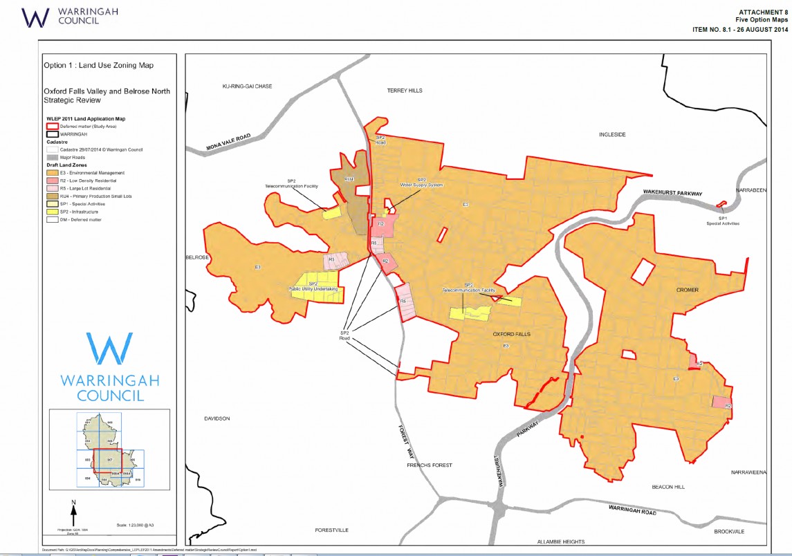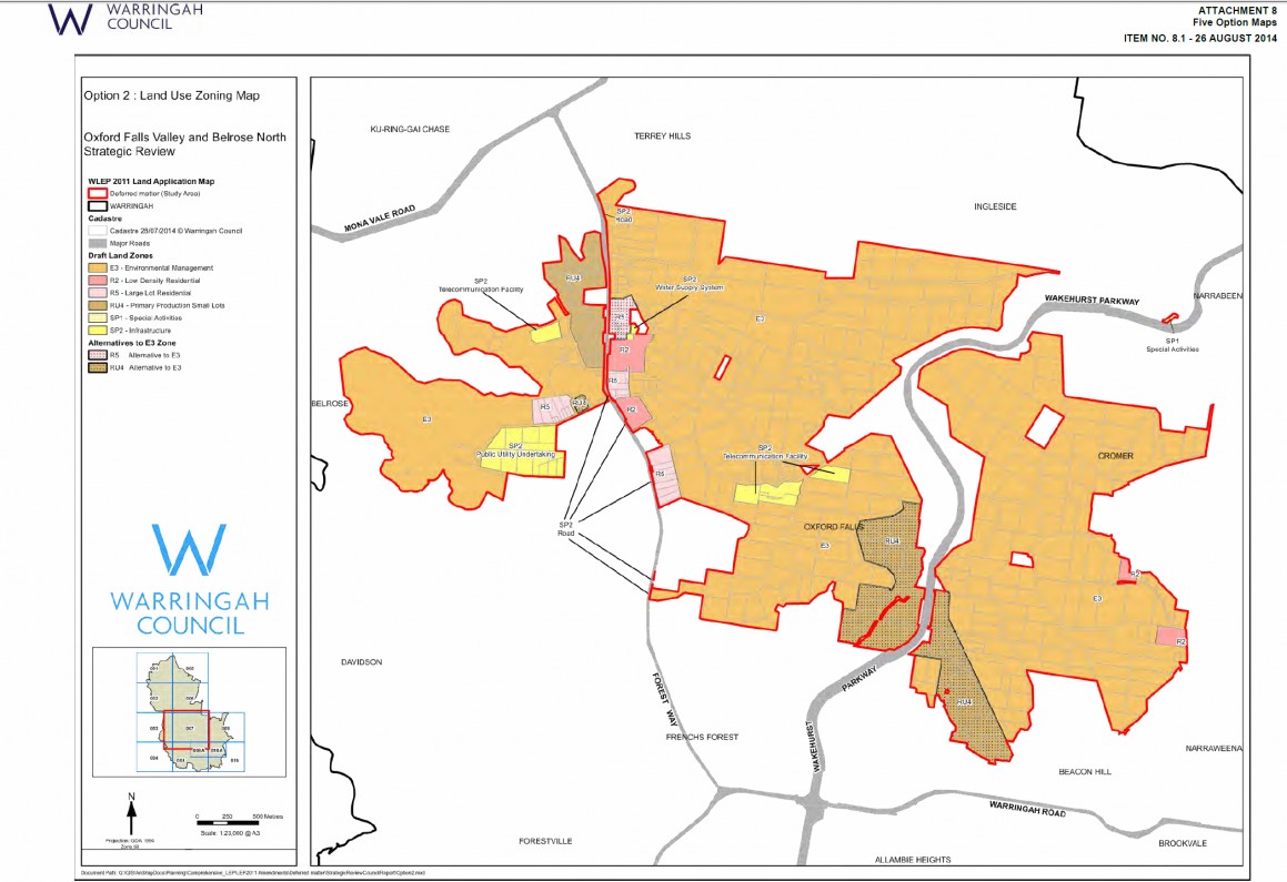 This option has had no consultation with the public or WUFA. This has been put forward by Warringah Council as a compromise so that all land would be rezoned into the new LEP. This compromise zones some land in Oxford Falls Valley as RU4 (as requested by WUFA). This is good for those residents of Oxford Falls Valley, but leaves several properties that option 1 would not have zoned as E3, to be zoned as E3. These residents (and therefore WUFA) don't want to be E3. The losers in this option are the residents of Cromer, Red Hill, Morgan Rd, Oxford Falls Rd and Kelly's Way who own land that is of no or moderate environmental value. Even though their land is of no or moderate environmental value, they would be zoned as E3 under this option. Click here to see the map of Option 2.
