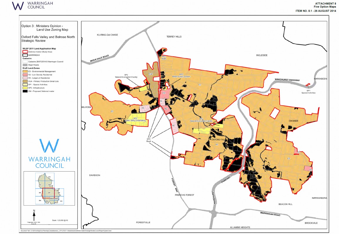 Warringah Council state this is in line with "The Ministers opinion that any land zoned E3 (under Option 1) that contains ‘no-to moderate’ environmental constraint should remain deferred."